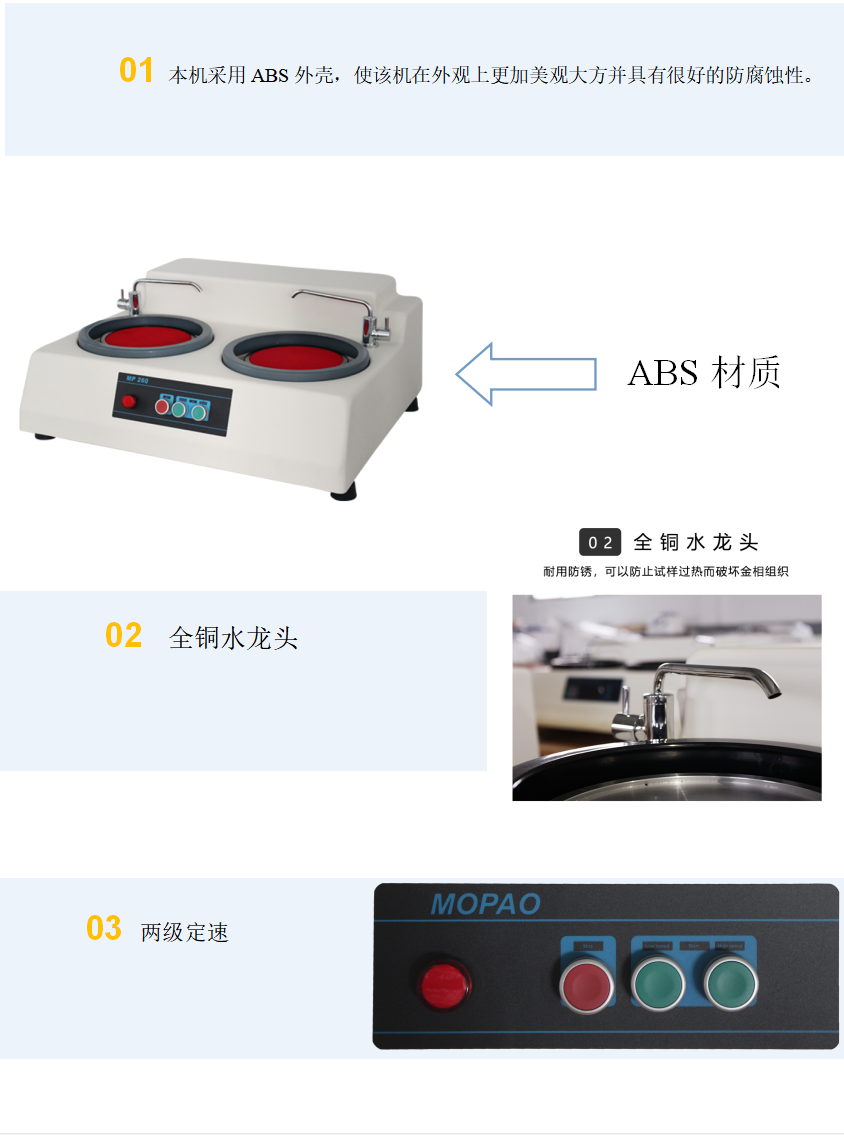 本機(jī)帶有冷卻裝置,可以在研磨拋光時(shí)對(duì)試樣進(jìn)行冷卻,以防止因試樣過熱而破壞金相組織。該機(jī)使用方便、安全可靠,是工廠、科研單位以及大專院校實(shí)驗(yàn)室的理想制樣設(shè)備。